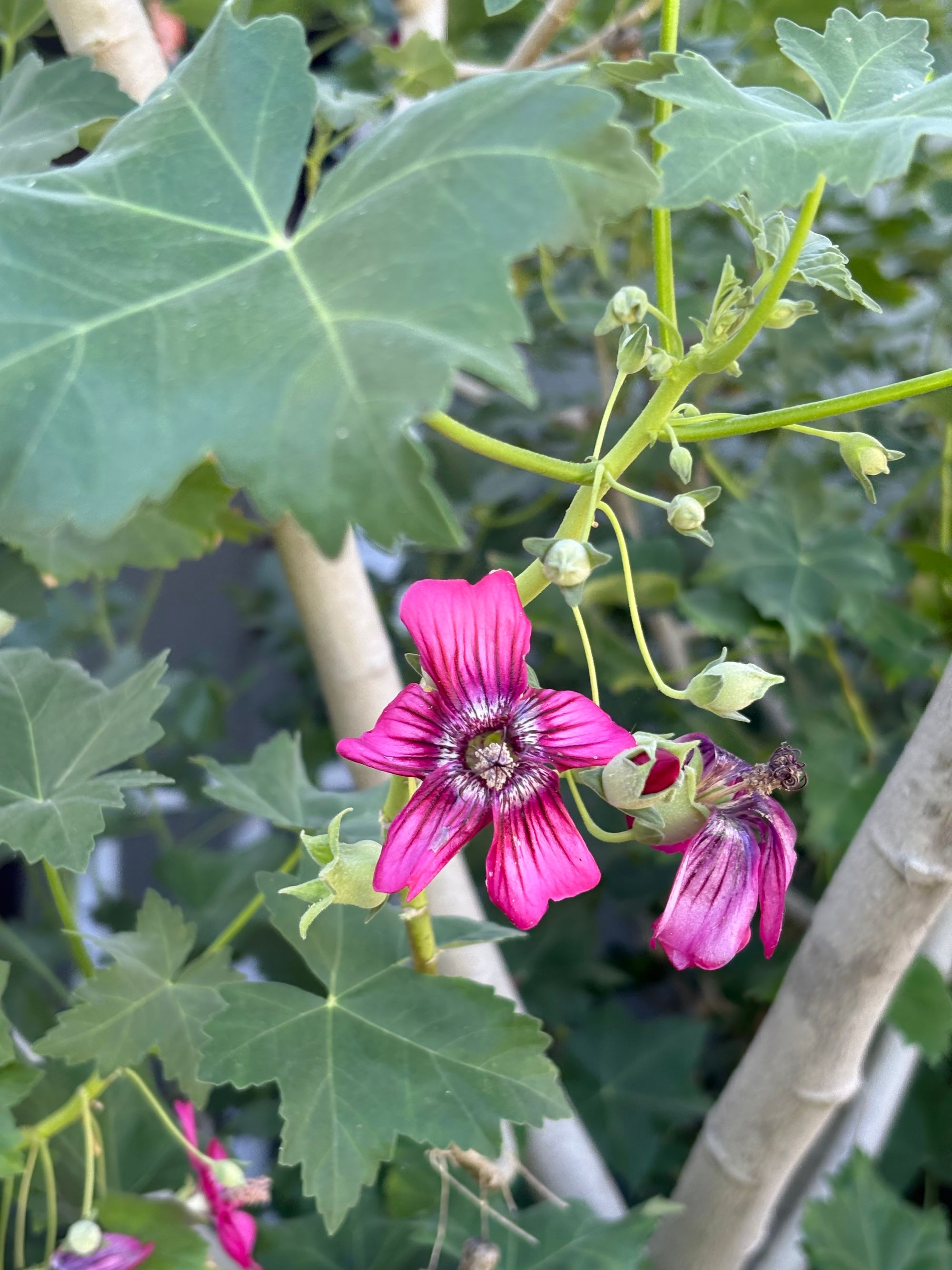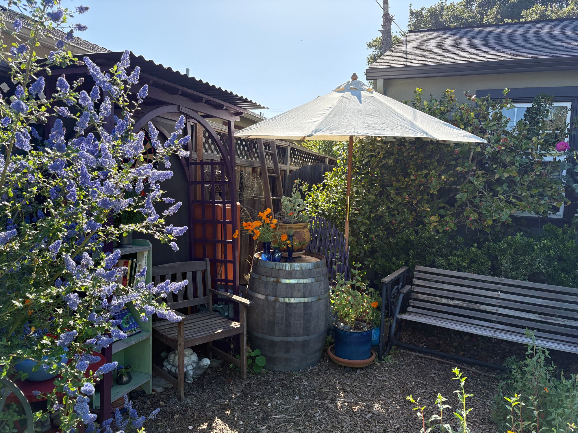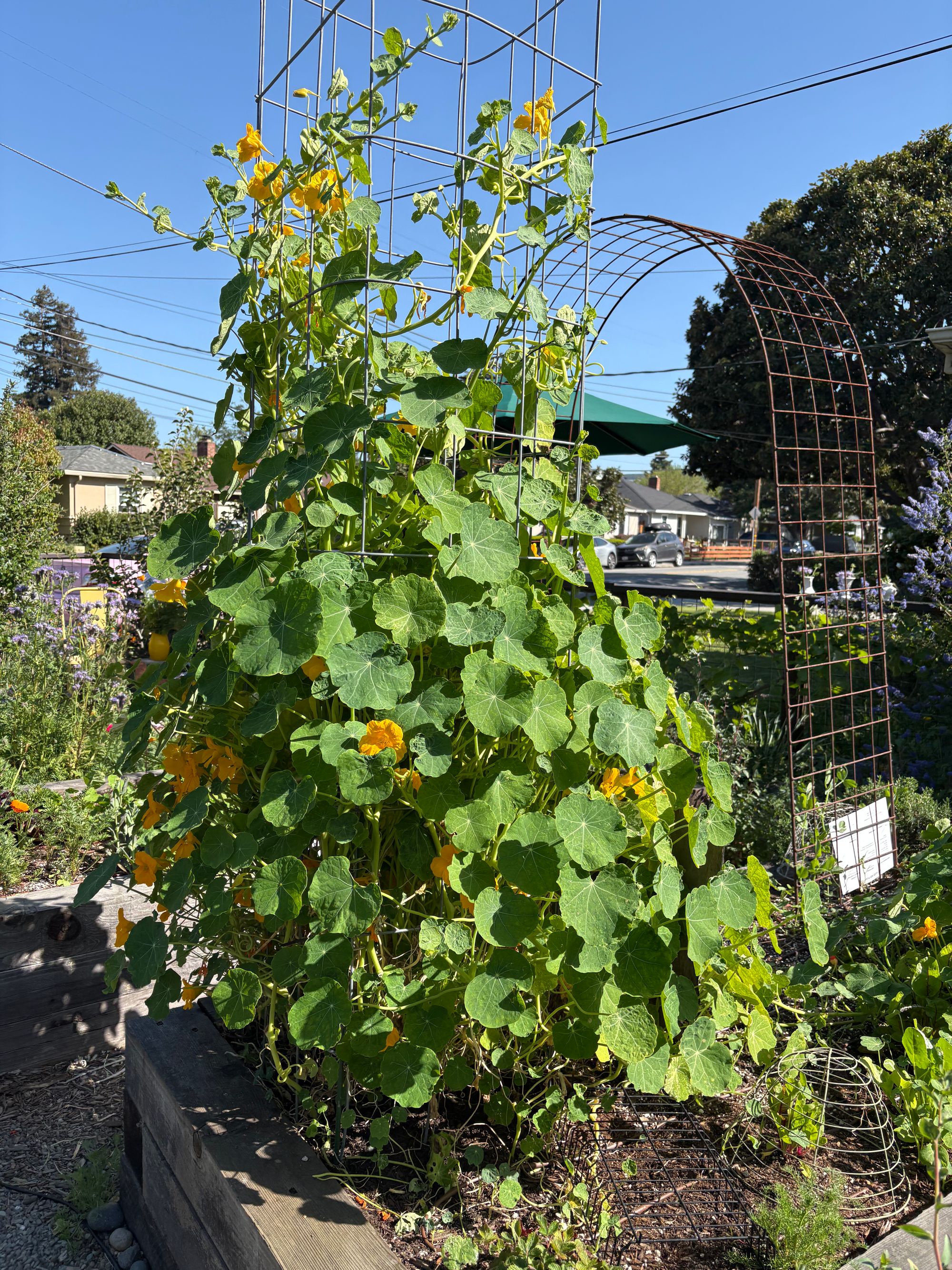 第二个设计上更精巧:外围终种了manzanita dr hurd; ceanothus ray hartman, 等灌木隐私做的很到位,里面还有个小遮阳伞和书架,小径旁边的草都是California native grass。把旱金莲Nasturtium绕着一个拱门,在菜床里做sacrifice植物。white sage & malva rose在我看来也颇为exotic,但一个红花高挂,另一个洋洋洒洒伫立在阳光里,很漂亮。