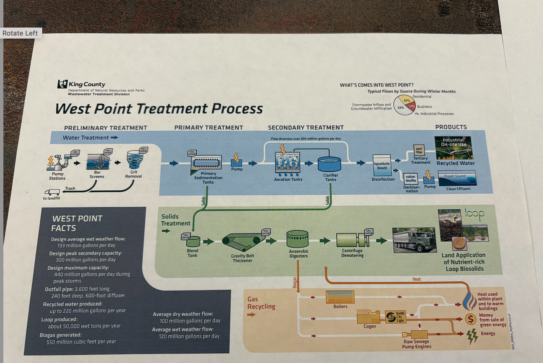 - Daily processing capacity, 200 million gallons, when reaching 50%, water goes directly to puget sound after primary treatment (no microorganisms processing). So each stage processing capacity is different? not sure could ask them later. Chicago wastewater treatment seems to be the largest.