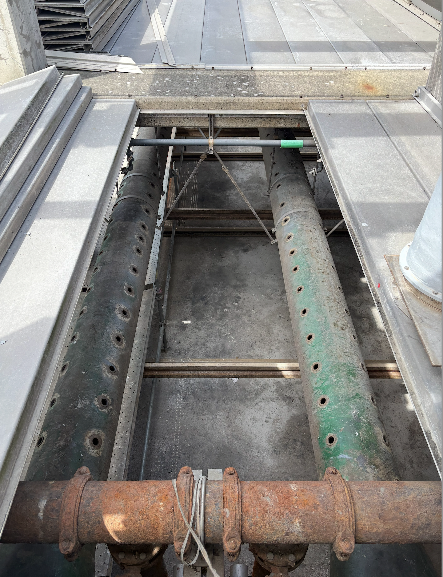 Primary treatment, sedimentation tank. From the picture, you can see iron bars are placed at the bottom tank, scraping the poop back to concentrate them.