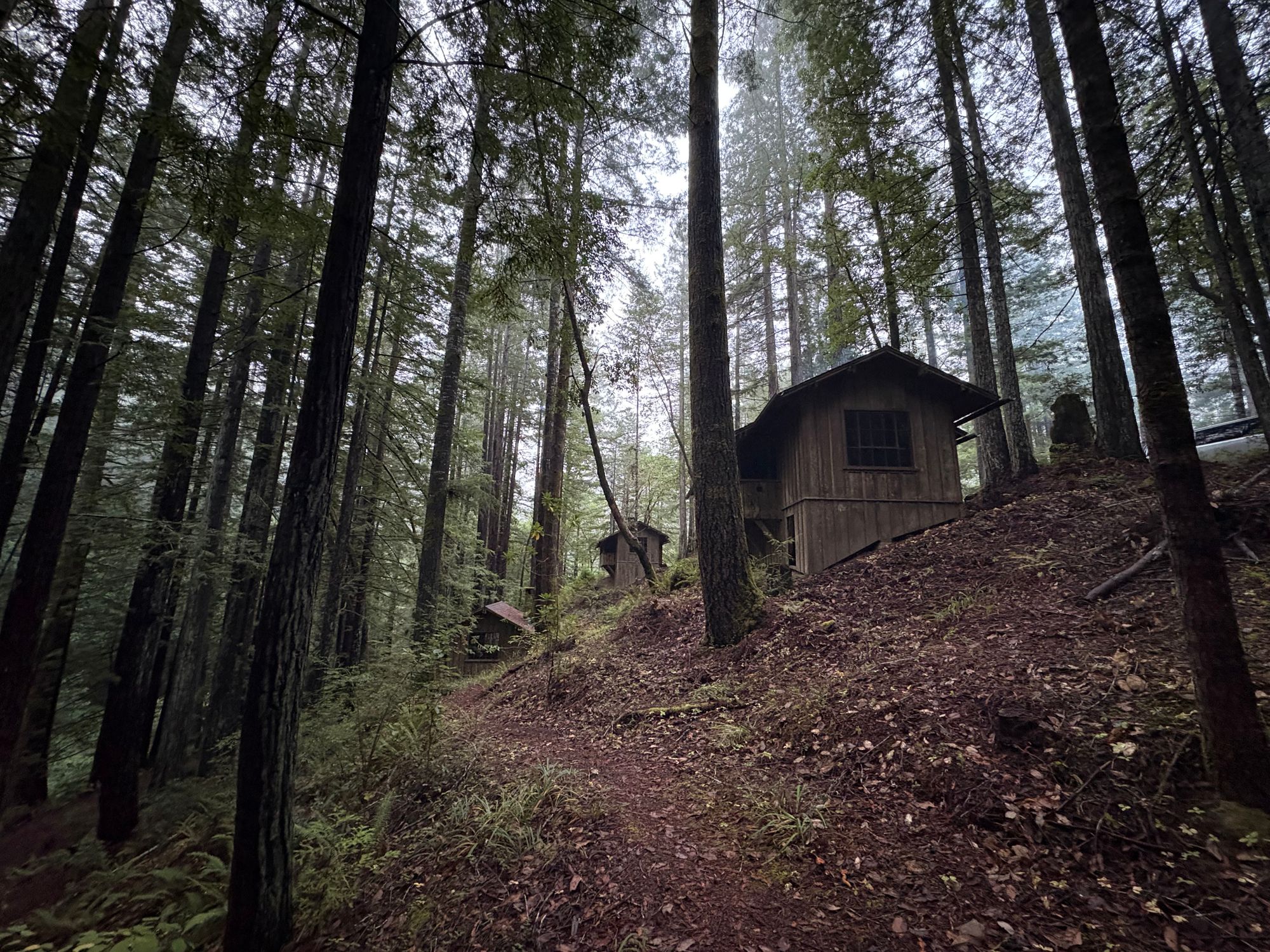 用头灯找到了自己的cabin 45,进去和想的一样,木屋里只有两张床,没有电,我拿出睡袋,盖上毯子,倒头就睡。第二天走出木屋才看清楚这redwood里的环境:隔着一段有一处小木屋,简陋却坚固,mendocino county 的redwood长得细长茂密,湿润的环境树皮上长着青色的地衣。朦胧的雾霭之中,听不到喧闹,偶尔有人走过,脚下踩着,发出咯吱咯吱的声音。