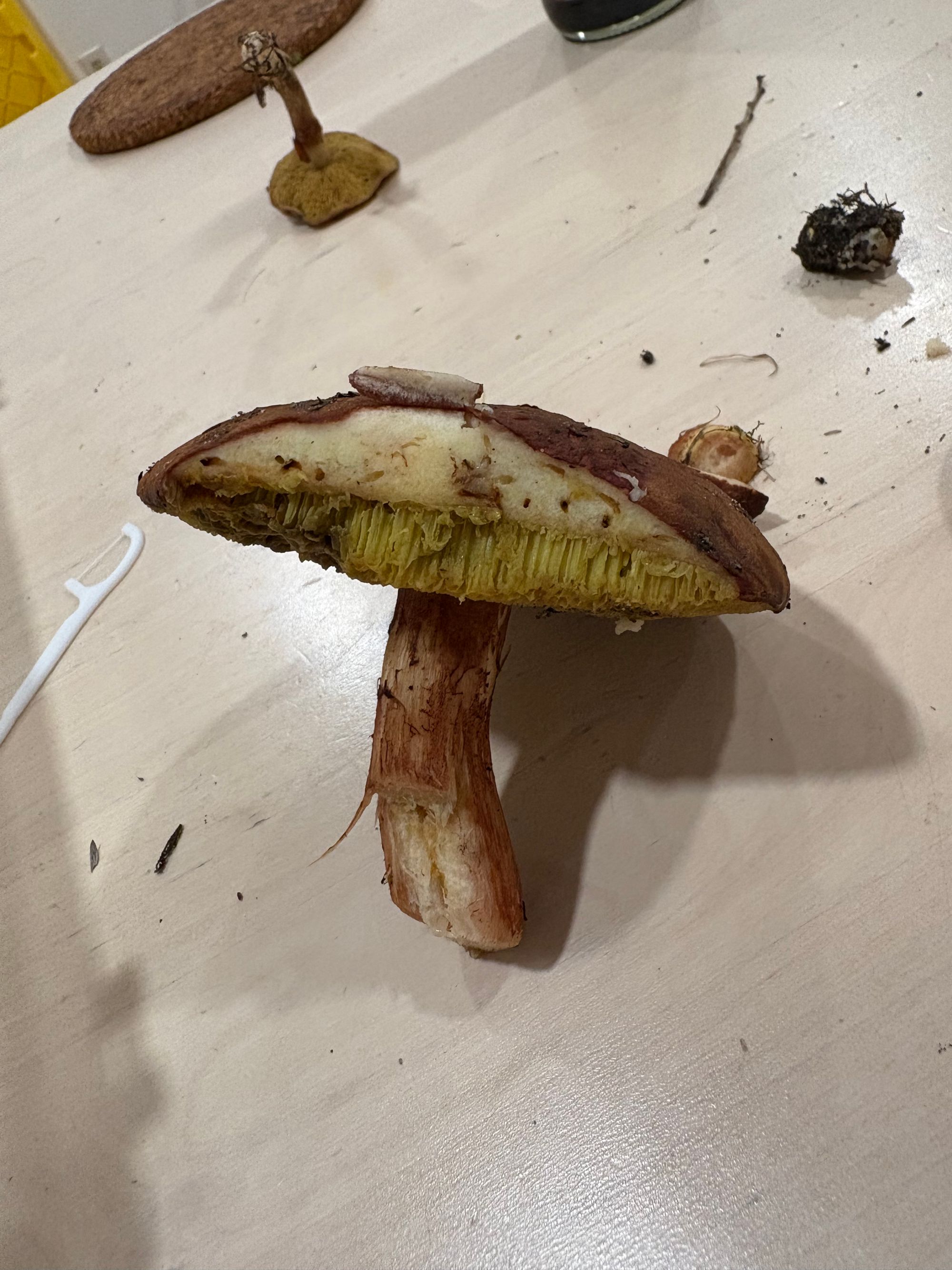 We also found some boletes. With slime and brown cap. For boletes, if they blush (changing color), especially turning blue/red, it's not harmful, but whether it's tasty is another question. In the end with ID book, I think it's suillus brevipes. edible but i didn't try.
