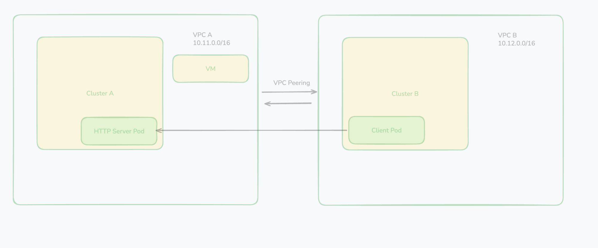 To ensure everything is configured correctly at infra level, I created a VM in the destination side VPC. Client Pod -> VM ip is successful. So it got to be something on the server side to explain the differences.