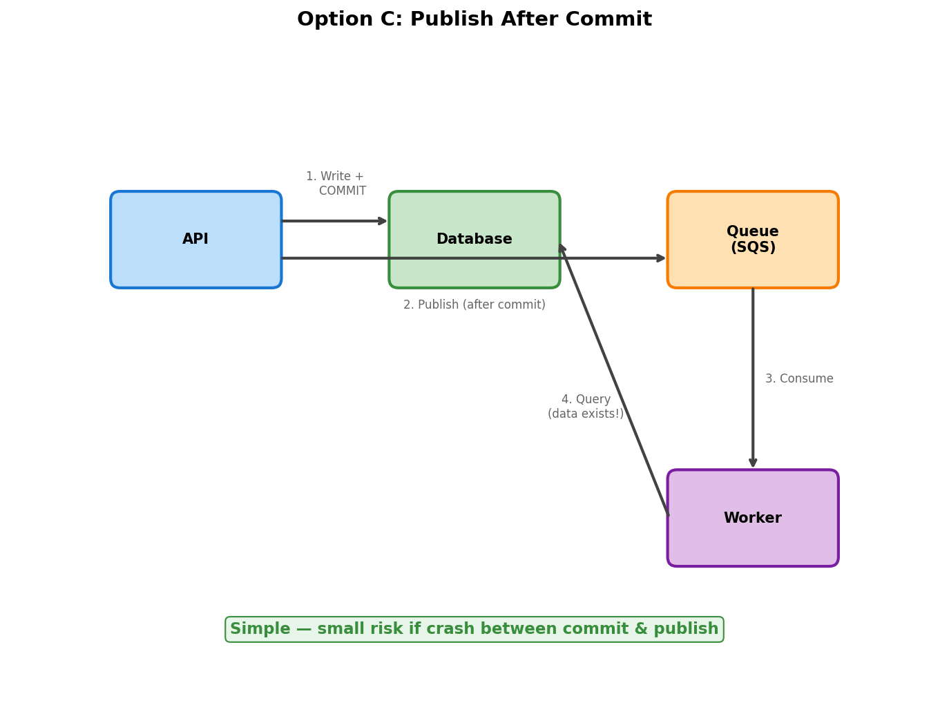 Publish the message after the transaction commits. Yes, there's a small window where the API service could crash after commit but before publish, leaving orphaned work. In practice, this happens rarely. Less elegant than outbox or CDC, but simpler operationally.