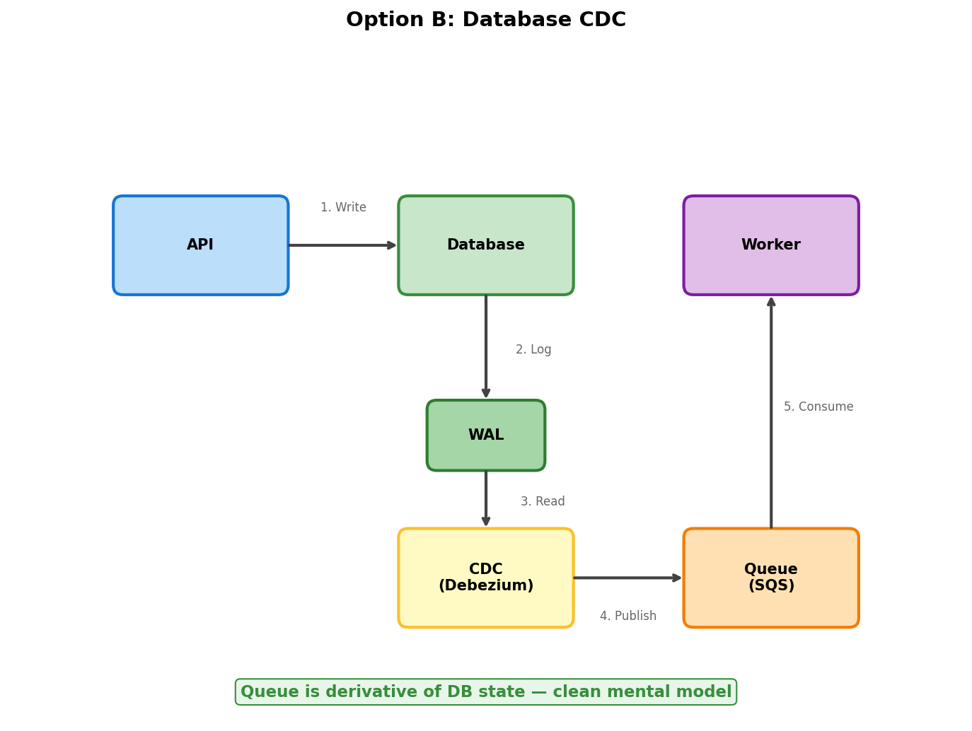 This is more advanced. Change Data Capture makes all consistency guarantees at the database level. Based on the WAL (write-ahead log), a CDC job (e.g., Debezium) pushes messages to the queue. The correctness has a very clean mental model—the queue becomes a derivative of database state. But it's probably too much infrastructure to set up for many teams.
