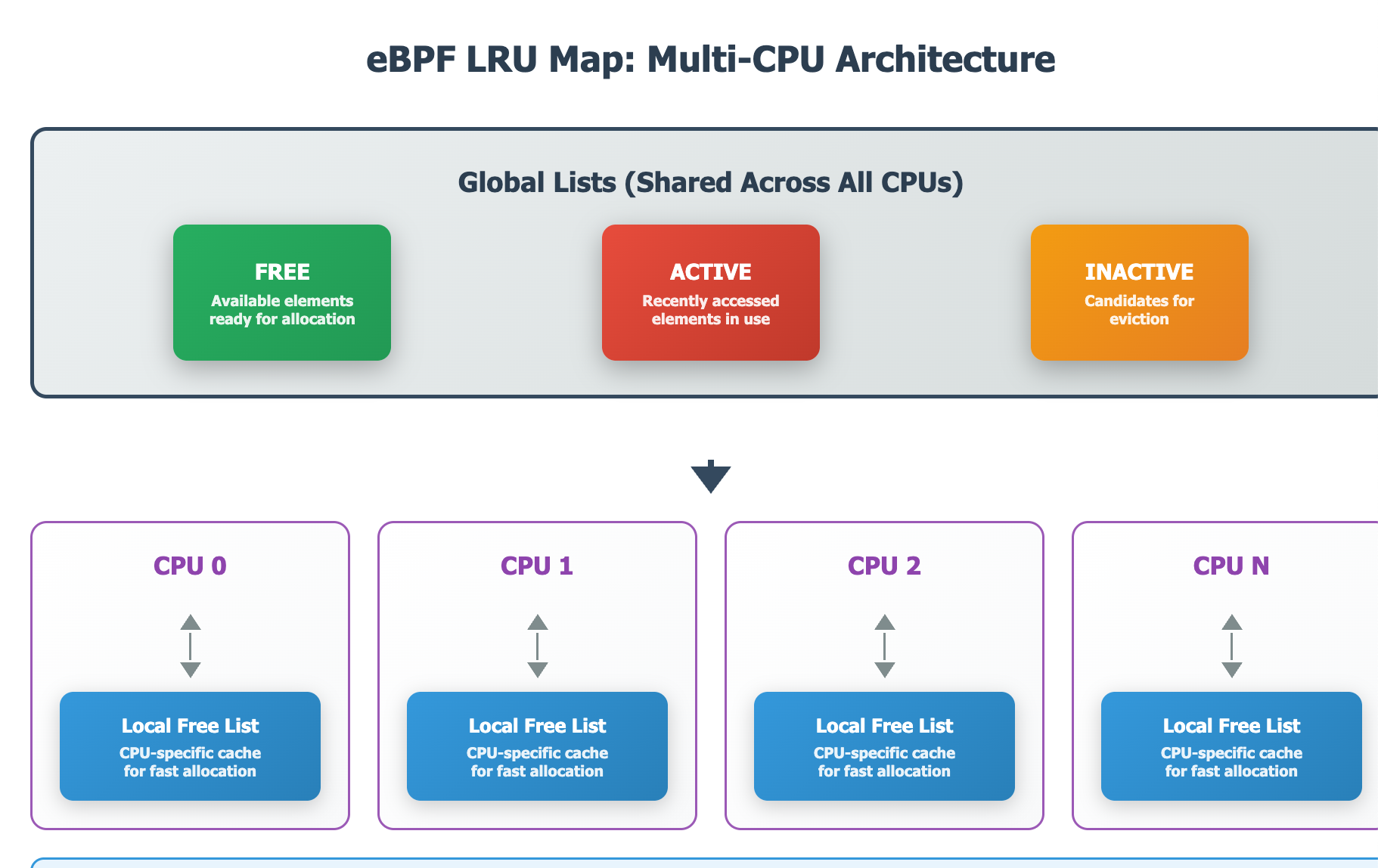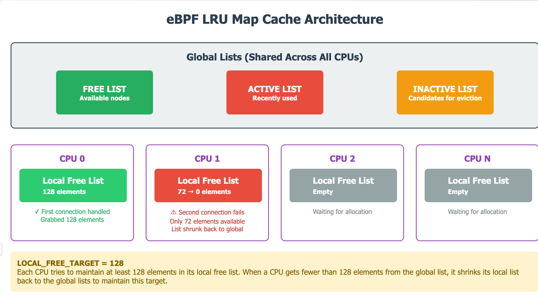 128 elements from the global list.LOCAL_FREE_TARGET - Active/inactive/free lists are rotated and managed along LRU map access.