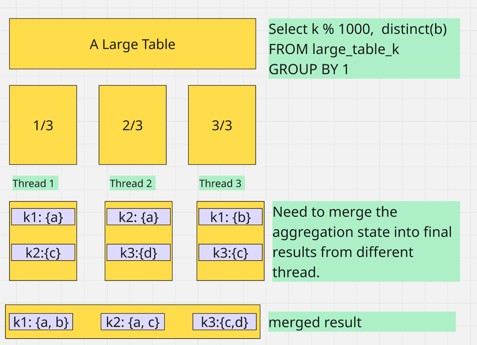 - When fixed hash map is used, every aggregation state is stored in a single one dimension array. Such bucket based parallel merge is not possible.